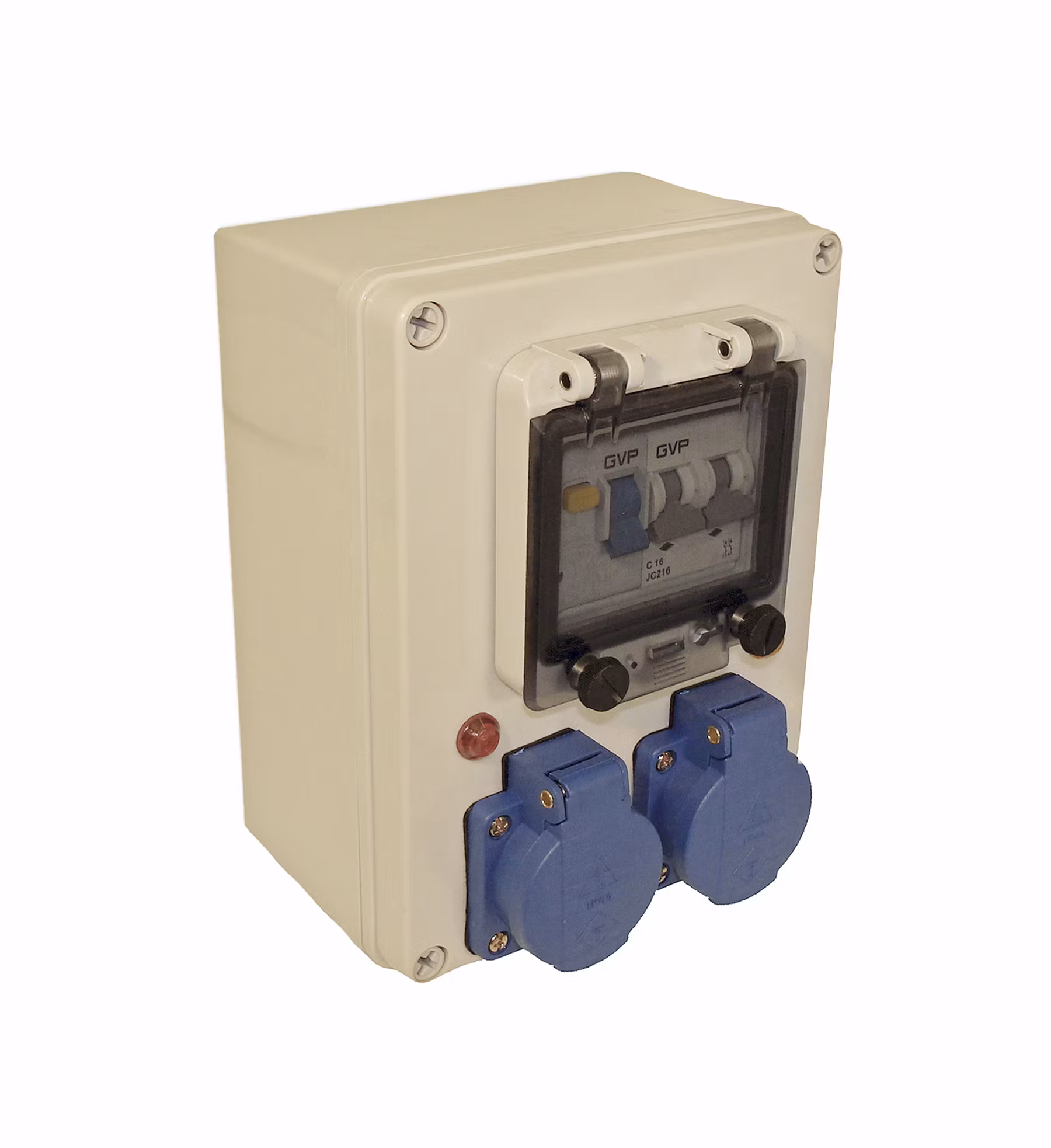 Central de alimentación de tierra para barcos, caravanas y autocaravanas con 2 tomas, disyuntor de corriente residual de 2 polos y fusible automático de 1 polo.