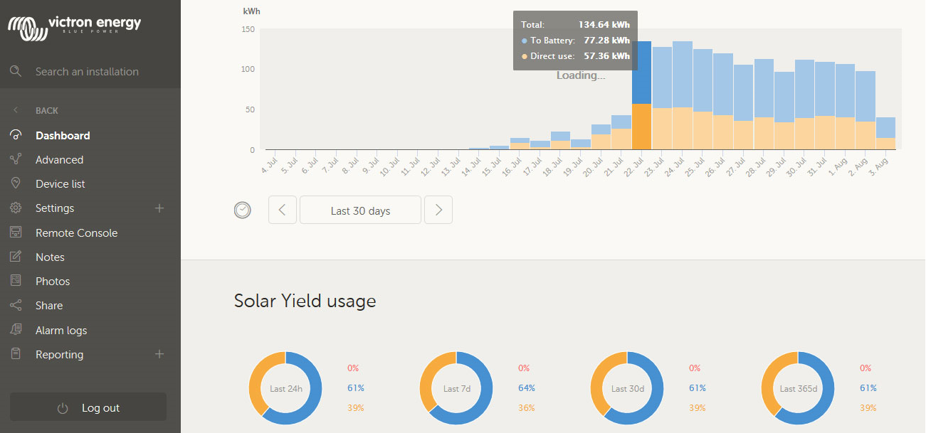 Toinen JAVEPA-etu on, että koko järjestelmää voidaan valvoa etänä Victronin etähallintaportaalin VRM:n avulla. , jotta asennuksen vianetsintä ja hienosäätö voidaan suorittaa ilman asentajan teknikoiden käyntiä paikalla.