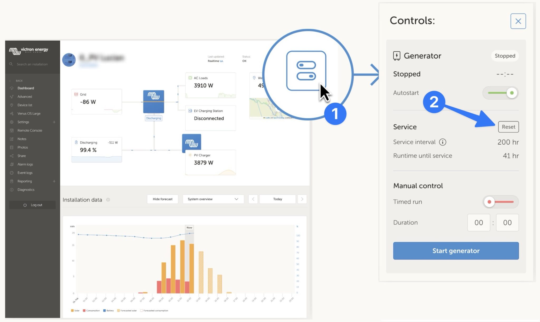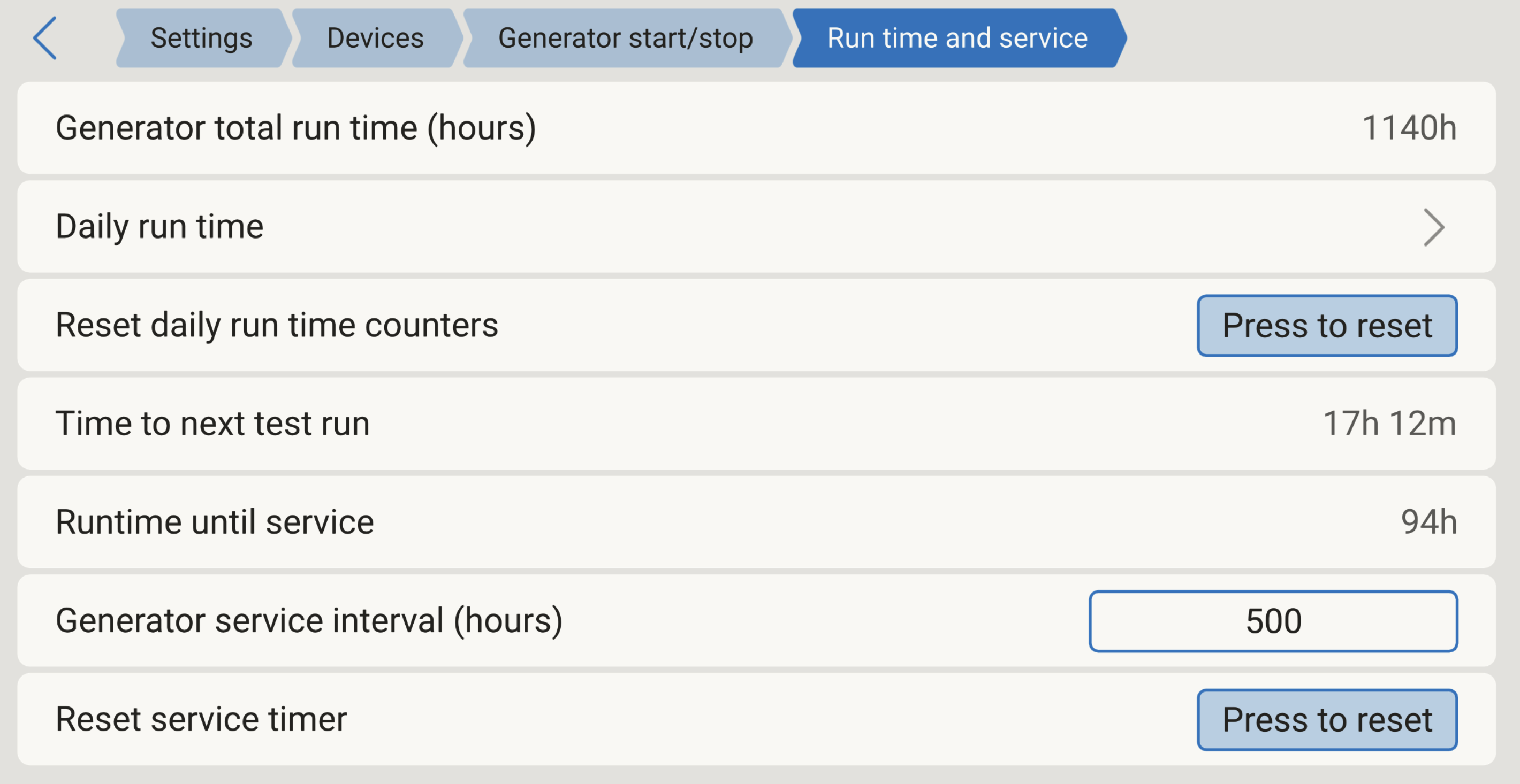 Jos asennuksessasi on GX-laitteen aktivoima automaattikäynnistysgeneraattori, hyödyllinen ominaisuus VenusOS:ssä on mahdollisuus seurata käyntitunteja ja laskea huoltoväliä. Tämä asetetaan alun perin automaattikäynnistysgeneraattorin hallintavalikossa itse GX-laitteessa.