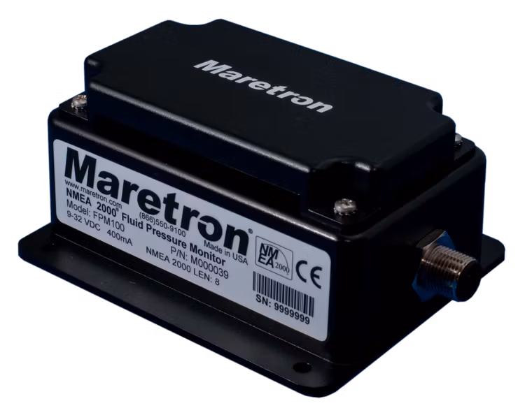 MARETRON FPM100-01, est un adaptateur pour la surveillance de la pression ou du volume de réservoir avec 6 entrées pour capteurs de pression, NMEA 2000. Le FPM100 est utilisé pour convertir les données de jusqu'à 6 capteurs de pression en NMEA 2000®. Cela permet de surveiller la pression des fluides et les niveaux de réservoir partout et de les afficher sur un écran NMEA 2000. Avec les bons capteurs, le FPM100 signale soit la pression, soit le vide pour une gamme d'applications, par exemple la pression d'eau, la pression d'huile, la pression hydraulique ou le vide pour détecter les filtres obstrués.