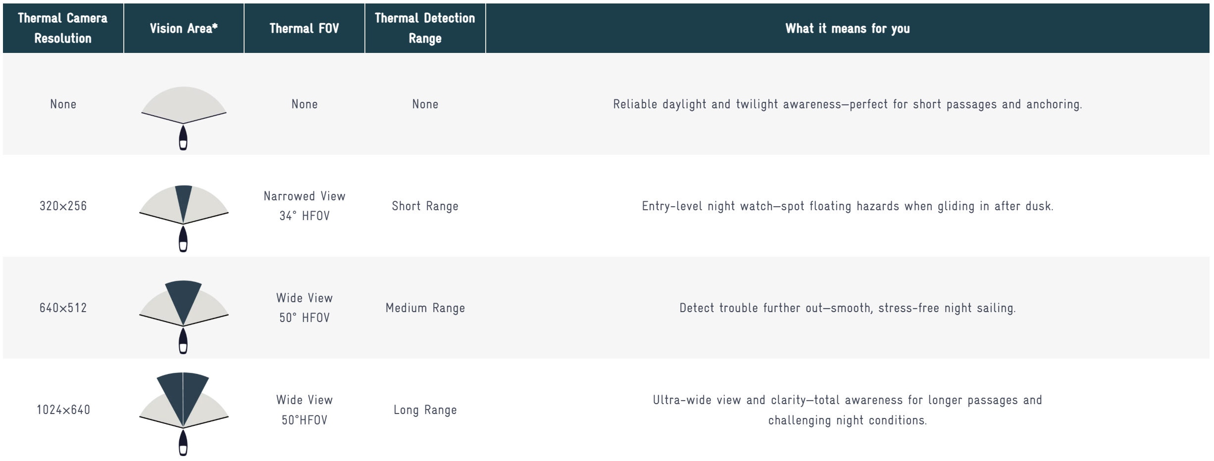 Watchkeeper-serien finns i flera versioner, från instegsmodellen med lågljusoptik för dag och skymning till mer avancerade modeller med långdistans-termisk kamera för full nattkapacitet. Oavsett modell erbjuder systemet en bred synvinkel och snabb reaktionstid som passar både kustnära turer och offshore‑passager.