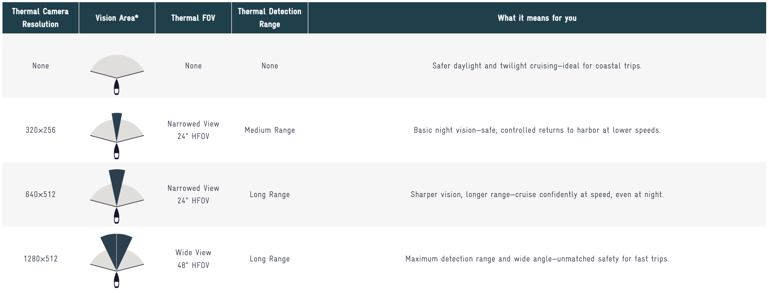 Watchkeeper 320 är den första termiska nivån i serien och ger grundläggande mörkerseende tack vare en 320×256 px termisk sensor med 24° synfält för motorbåtar och 34° för segelbåtar. Den är anpassad för säkra hemfarter i mörker och lägre hastigheter, och ger en tydlig värmebild som gör det möjligt att upptäcka små objekt på kortare distans även vid helt släckt omgivning. Perfekt för mindre båtar och för dig som behöver en enkel men pålitlig termisk lösning.