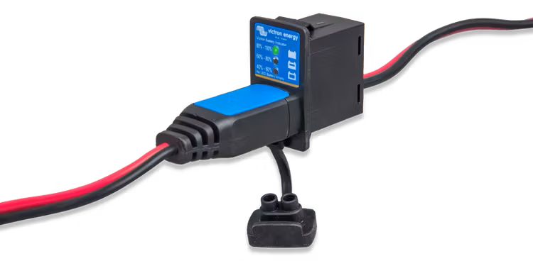 VICTRON ENERGY BPC900110114, is een batterij-indicator met aansluiting voor de IP65-serie. M8-aansluiting/30A zekering. Het paneel toont de status van de batter