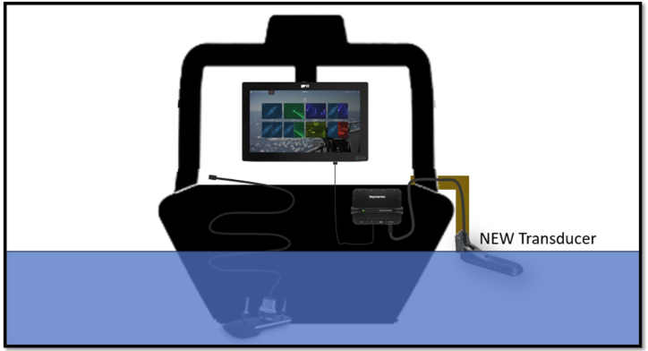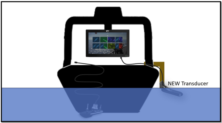 Stäng av SONAR-modulen, koppla bort den permanenta transducern från SONAR-modulen och anslut den nya testtransducern på sidan av båten.