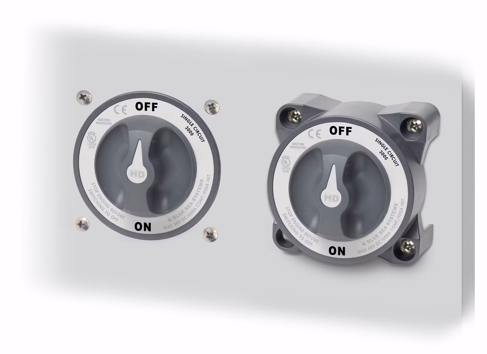BLUE SEA SYSTEMS 3000B, är en huvudbrytare i Heavy Duty serien för 1 batteri med 2 positioner (On-Off).
