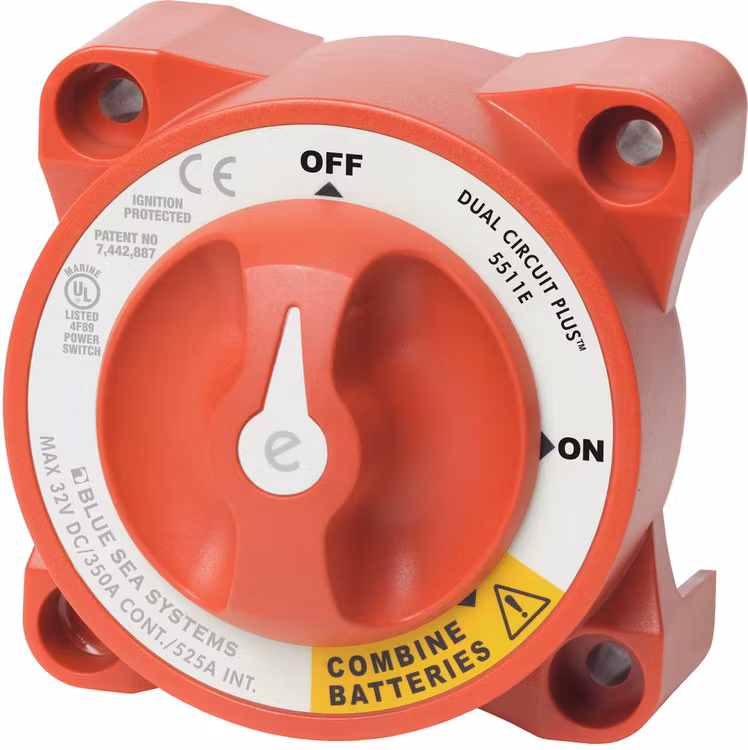 BLUE SEA SYSTEMS 5511eB, är en huvudbrytare för 2 batterier med (Dual Circuit Plus) med 3 positioner (On-Combine-Off). Med Dual Circuit Plus menas att en och samma huvudbrytare kan växla mellan två separata batteribankar eller kombinerar dem för att driva alla laster, med make-before-break-kontakter som möjliggör växling utan strömavbrott.
